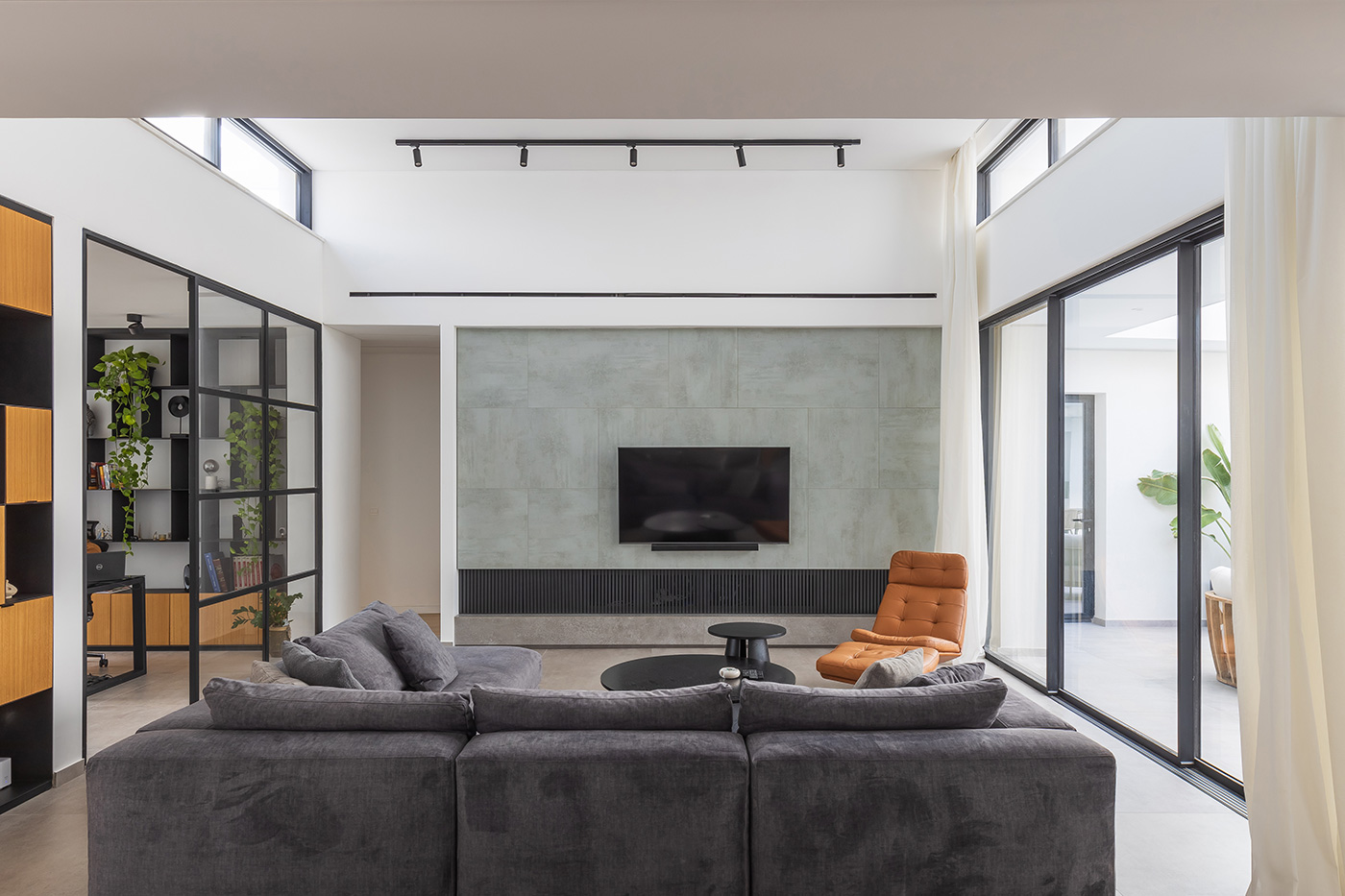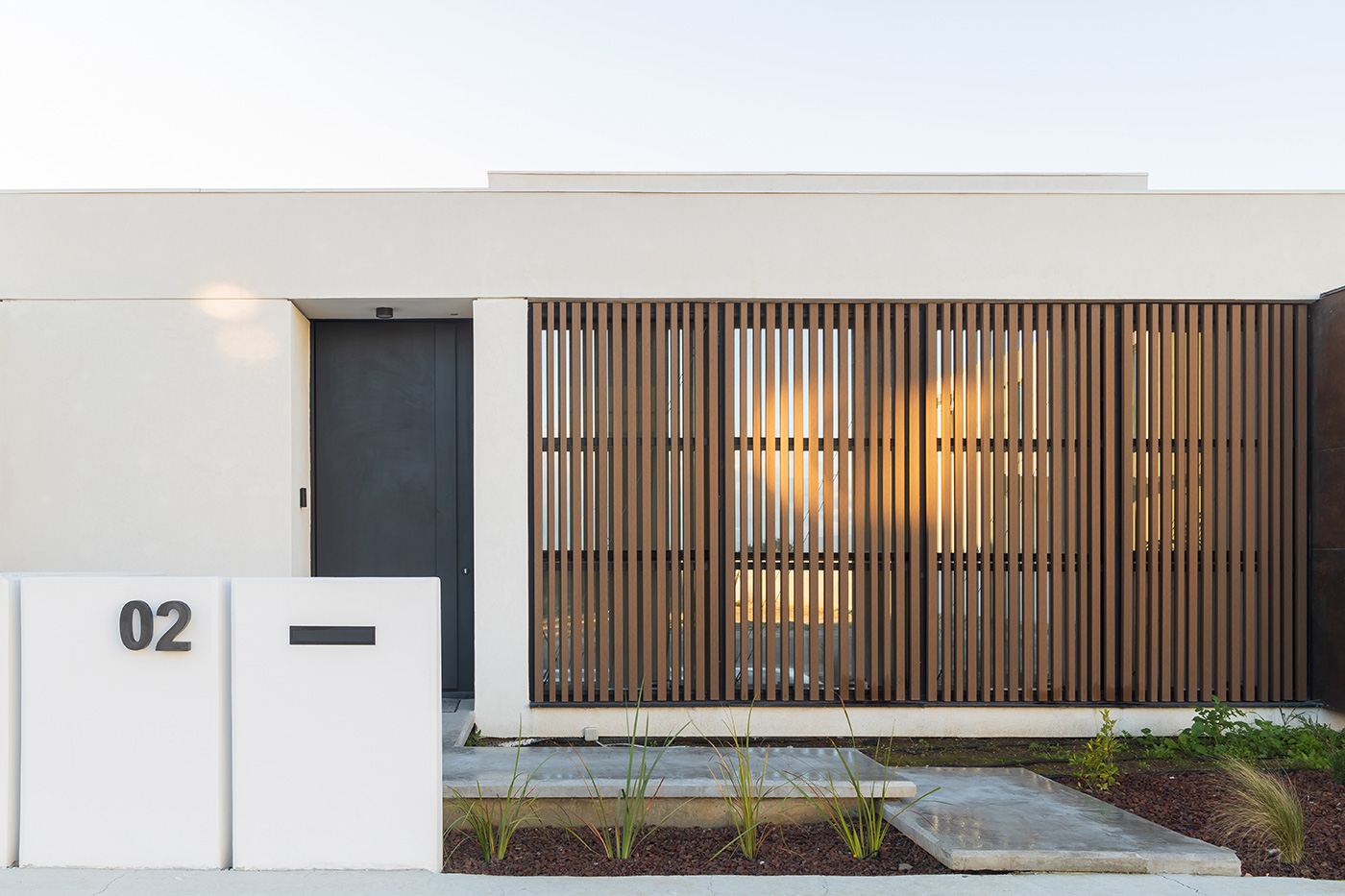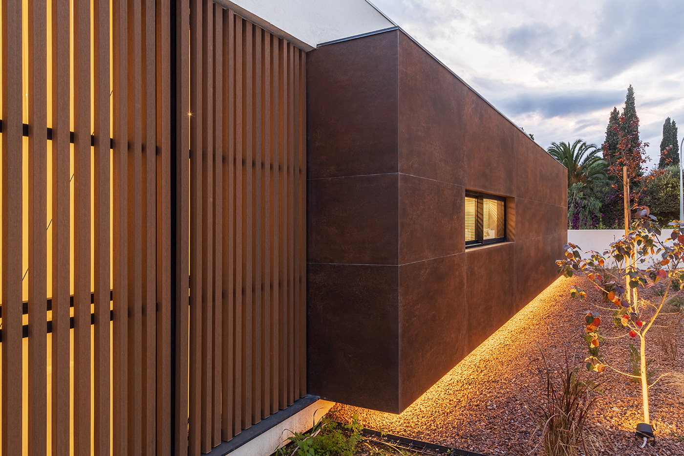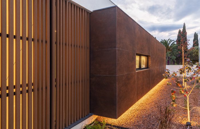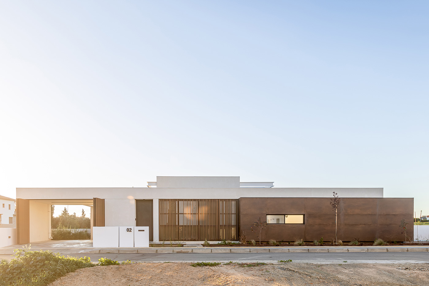 Η πρόσοψη οργανώνεται με γεωμετρική ακρίβεια, αξιοποιώντας τη δυναμική αντίθεση ανάμεσα σε λευκές επιφάνειες, μεταλλικά πάνελ σε γήινες αποχρώσεις και κατακόρυφες ξύλινες περσίδες. Οι υφές και τα χρώματα συνδυάζονται σε ένα αρμονικό αποτέλεσμα όπου ισορροπεί η μοντέρνα λιτότητα με τη φυσική ζεστασιά.