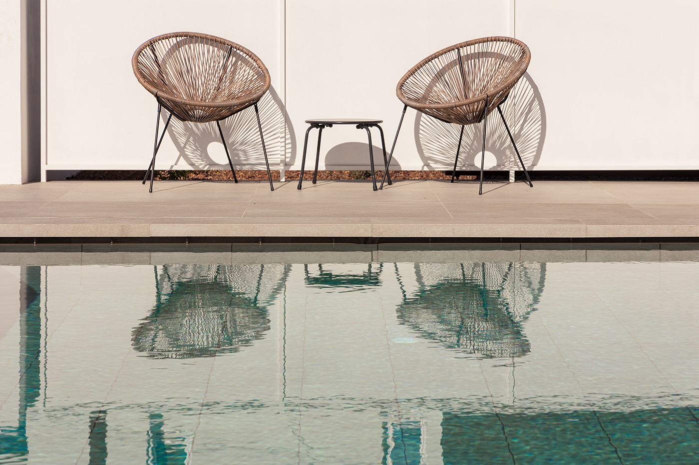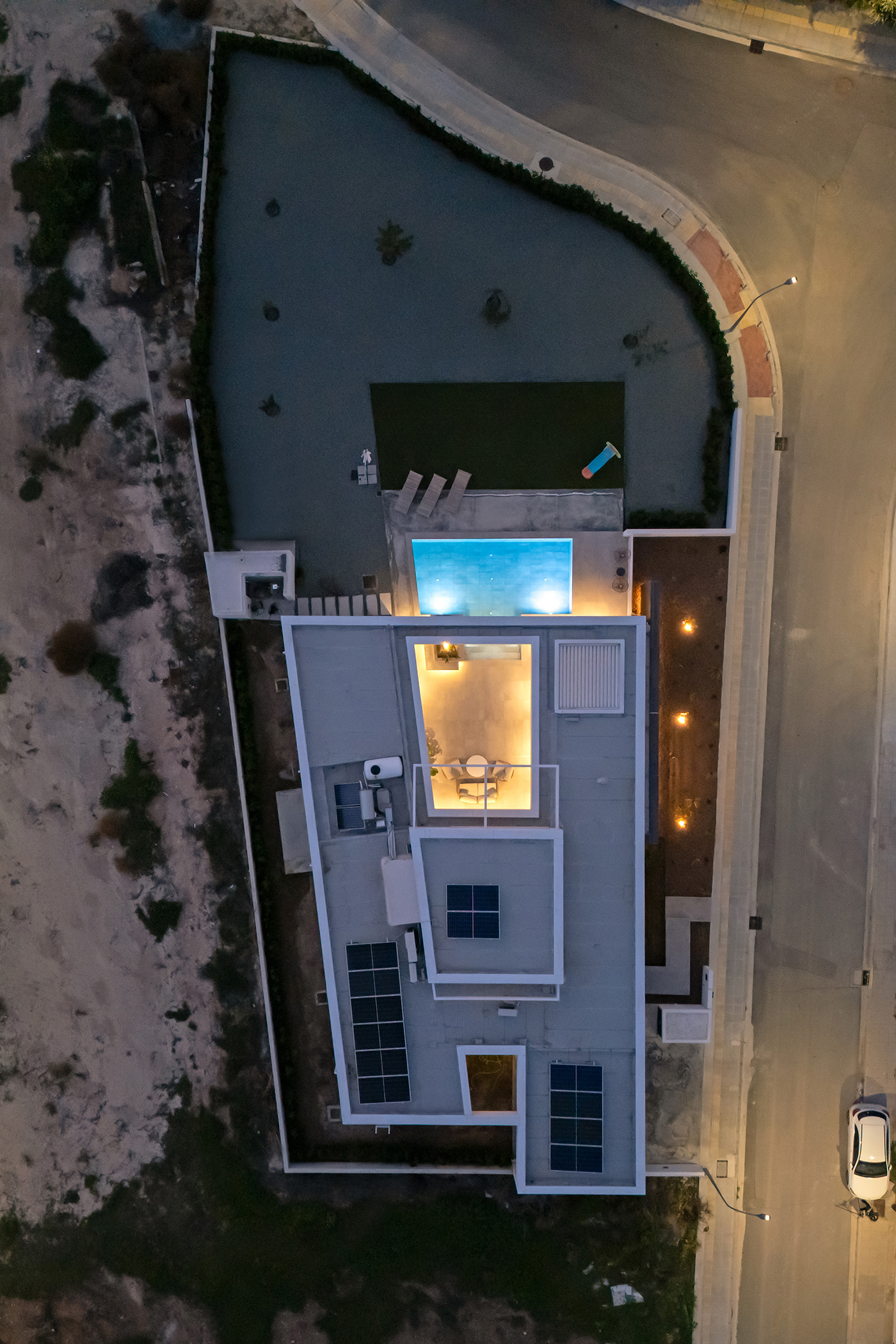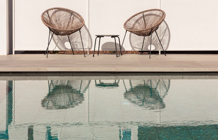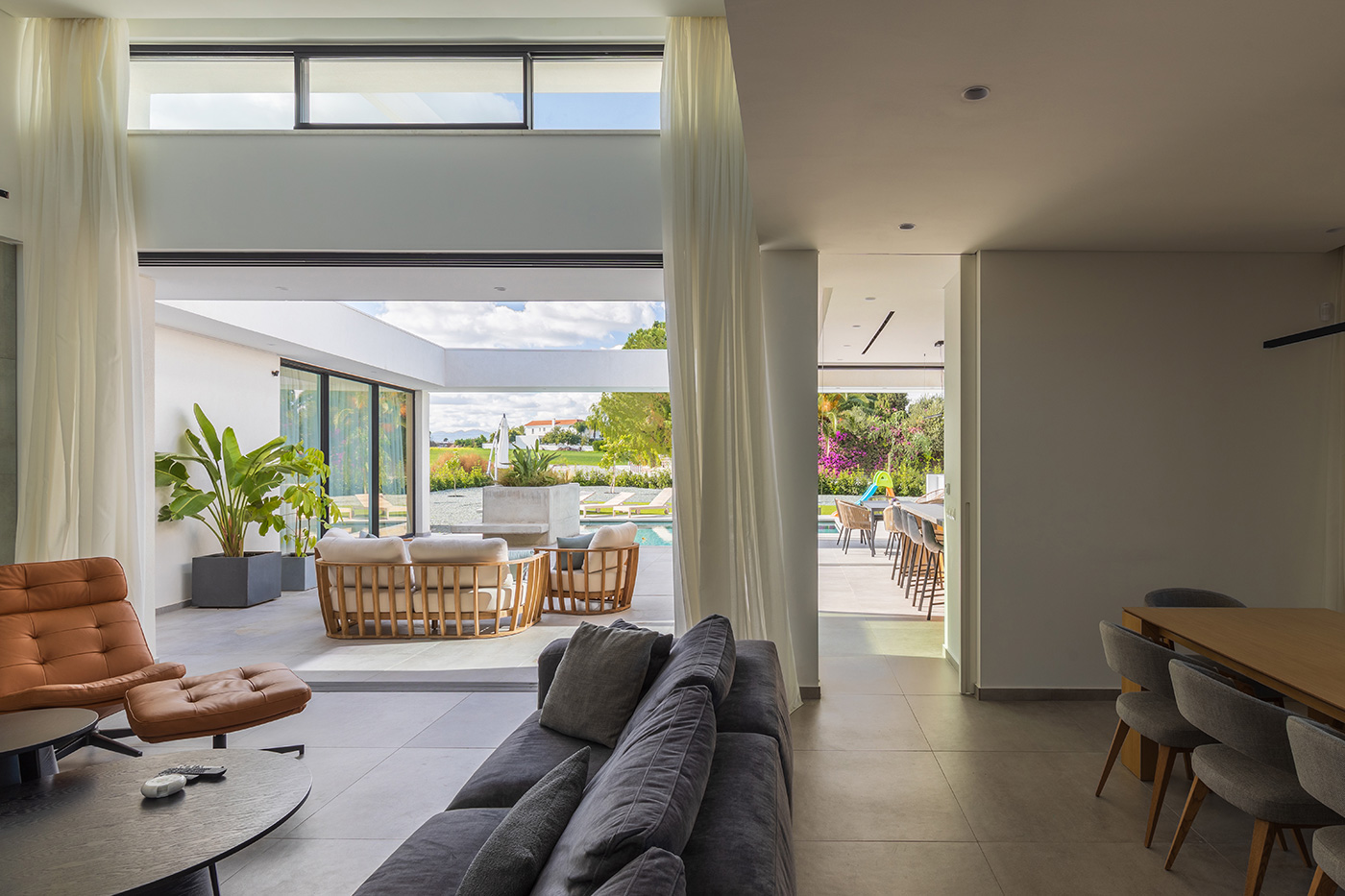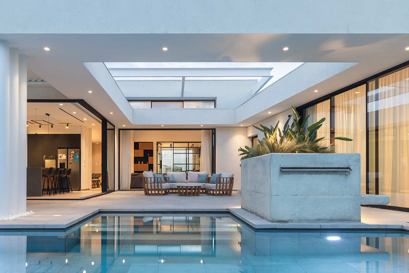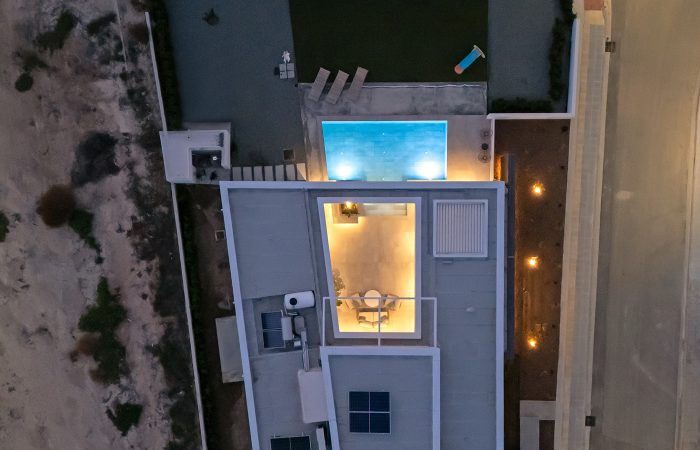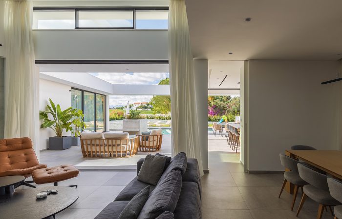 Όλοι οι χώροι οργανώνονται στο ισόγειο και στην ουσία περιβάλλουν την πισίνα με όλα τα μεγάλα ανοίγματα εντός να βλέπουν προς αυτήν.