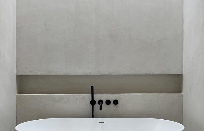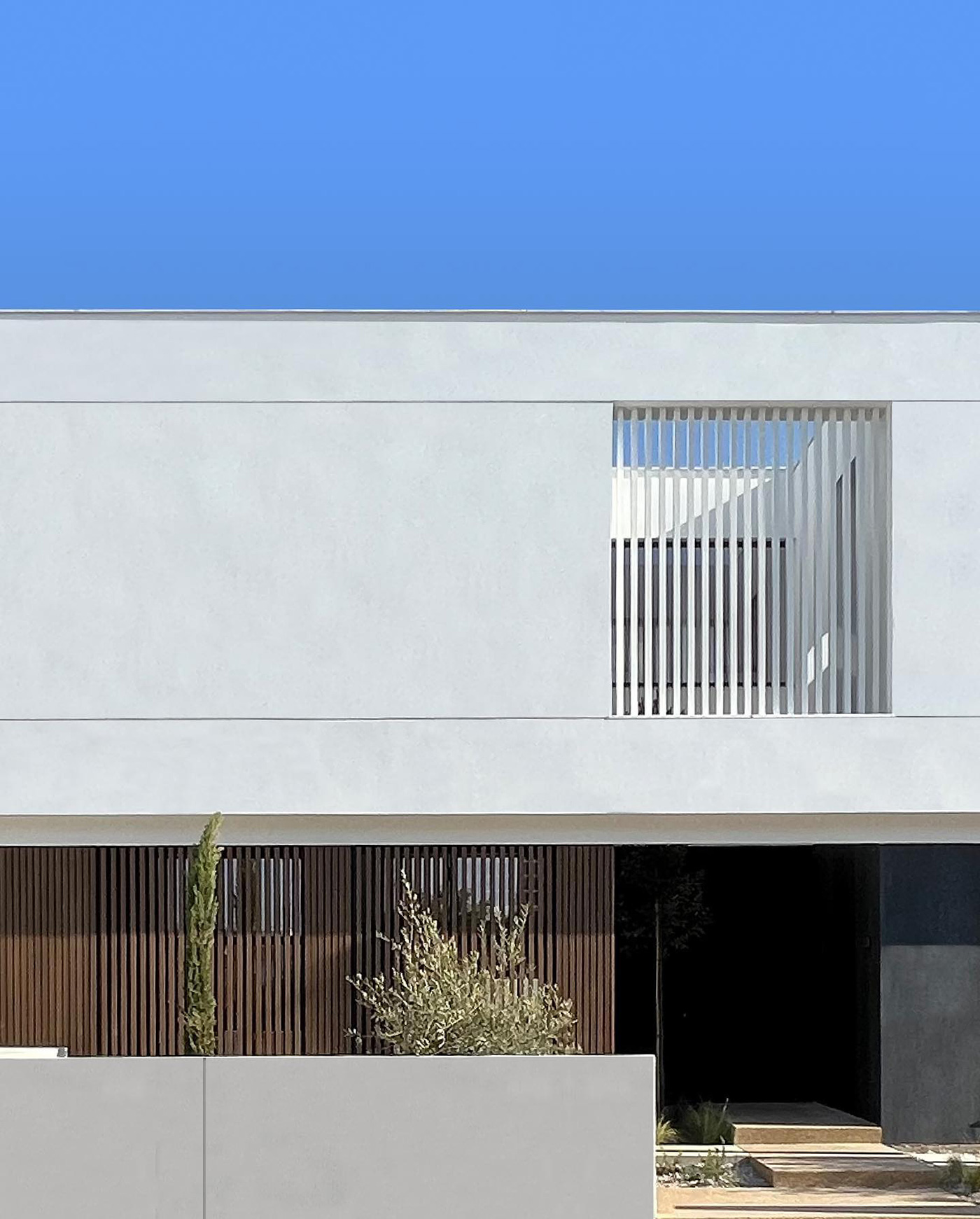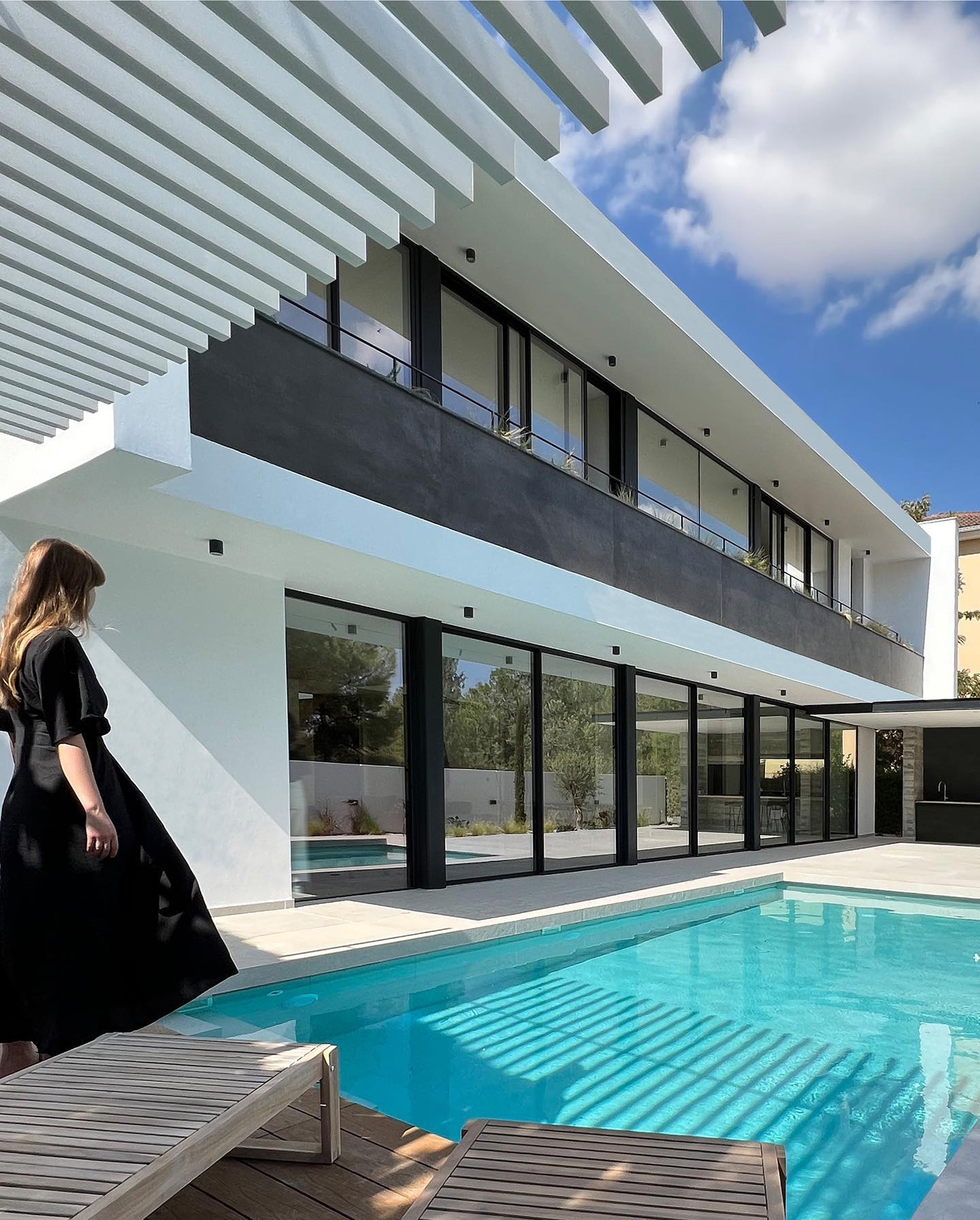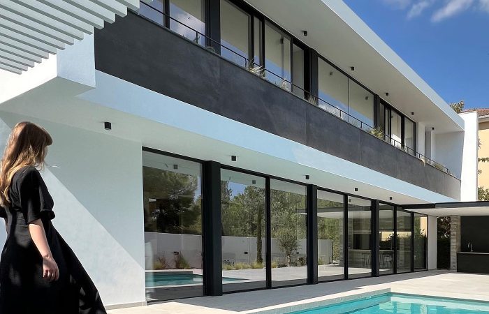 Η σύνθεση του κτιρίου χαρακτηρίζεται από καθαρές γραμμές, λιτότητα όγκων και αρμονία, στοιχεία που αποτυπώνονται τόσο στο εξωτερικό κέλυφος όσο και στους εσωτερικούς χώρους. Τα μεγάλα ανοίγματα των κοινόχρηστων χώρων και των υπνοδωματίων ανοίγουν προς την αυλή, όπου δεσπόζει η πισίνα, ενισχύοντας τη σύνδεση εσωτερικού και εξωτερικού χώρου.