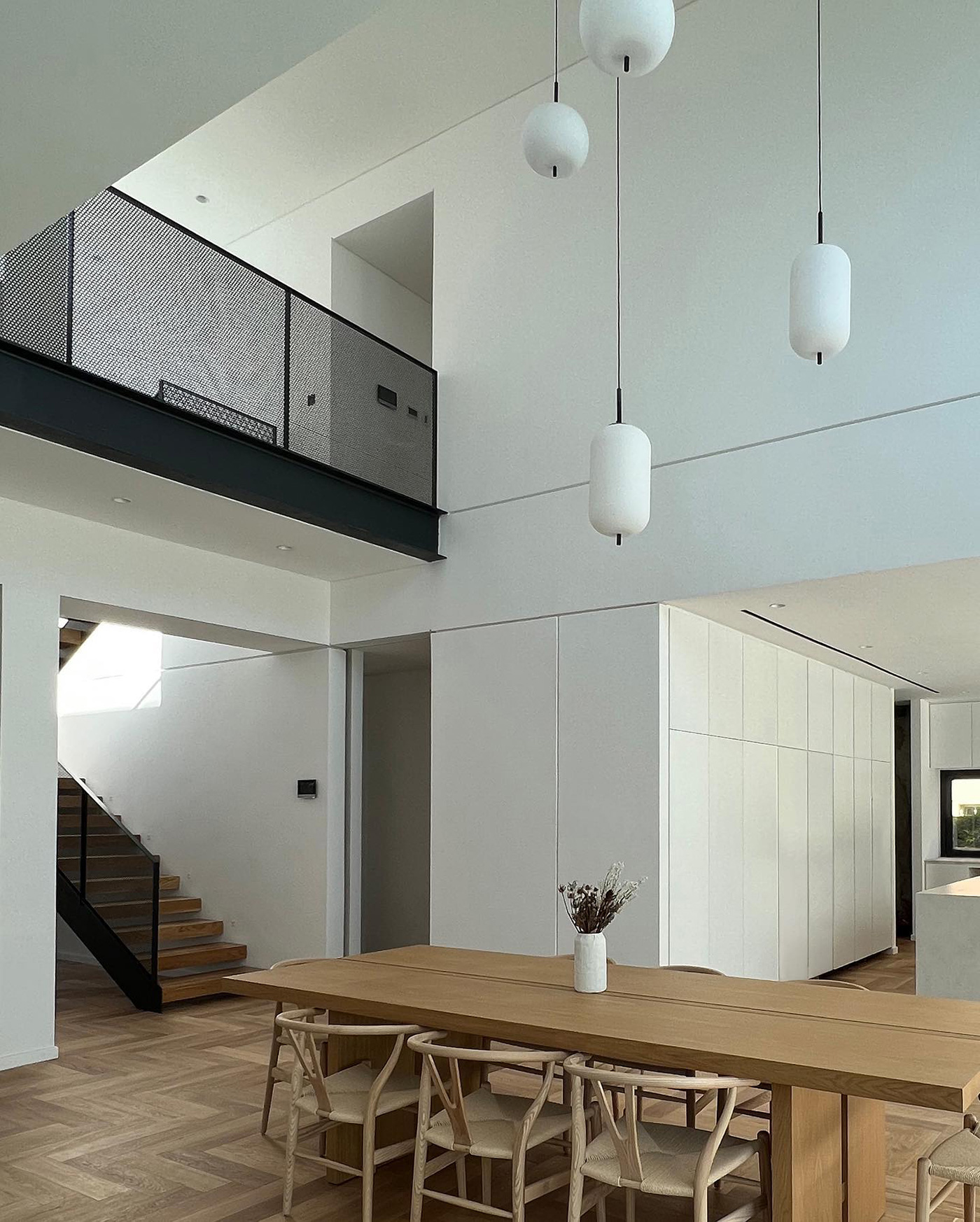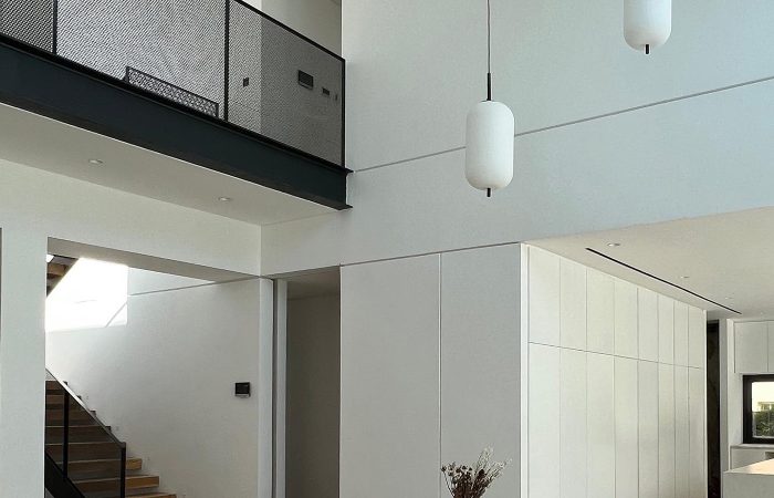 Στο ισόγειο, σε open plan διάταξη, χωροθετούνται οι κοινόχρηστοι χώροι — η κουζίνα, οι βοηθητικοί χώροι και το καθημερινό σαλόνι — ενώ παράλληλα περιλαμβάνονται ένα γραφείο και ένας ξενώνας. Στον όροφο βρίσκονται τα τρία (3) υπνοδωμάτια, με το κυρίως υπνοδωμάτιο να διαθέτει en-suite μπάνιο, καθώς και το πλυσταριό.